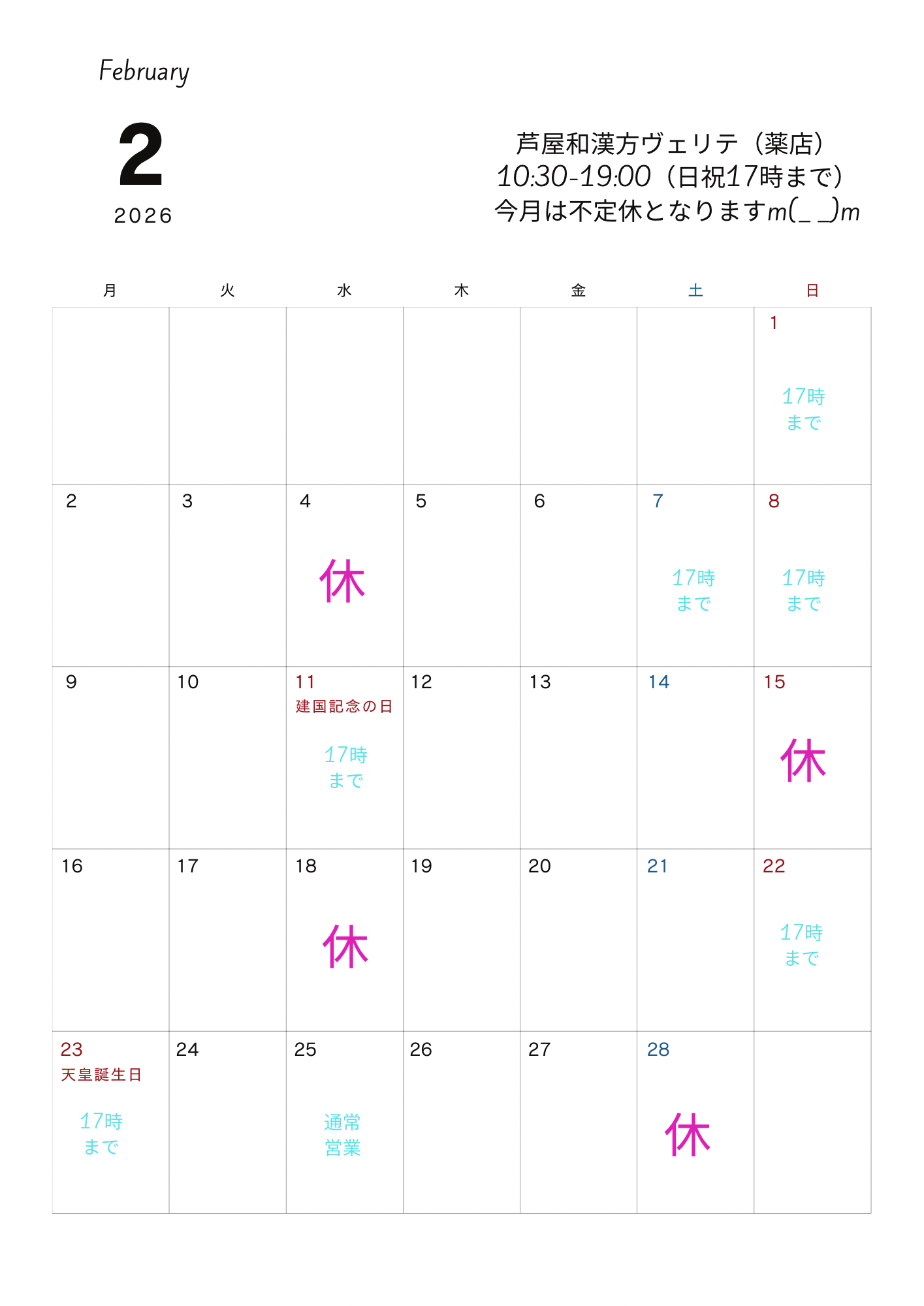 2026.2.2月 2026年2月、3月休日予定を更新致しました。